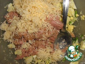 К яйцам добавить тунца (слить предварительно масло) и тертый сыр