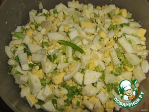 Яйца порубить, добавить резаный лук, чуть соли по вкусу, если хотите. -