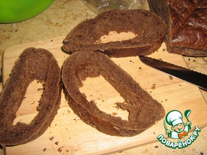 Подготовить хлеб. У меня был воздушный черный батон, уже подсохший. Нарезать его на ломтики шириной примерно в 2 пальца, вырезать из них мякиш, но оставить по краям хотя бы полсантиметра.