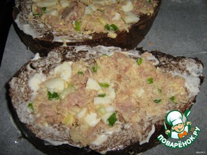 Заполнить приготовленной массой из туны, яиц и сыра.