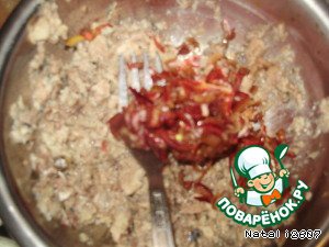 Красный репчатый лук почистить, нарезать мелким кубиком (я забыла сфоткать, поэтому и взяла из другого своего рецепта), ошпарить кипятком и залить лимонным соком, дать промариноваться минут 15-20.