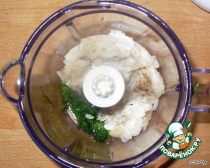 Приготовим начинку. Для этого нарежем на кусочки слегка подмороженное филе одной рыбы и укроп. К рыбе с укропом добавить сливки, посолить, поперчить и все измельчить блендером.