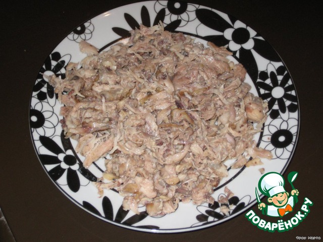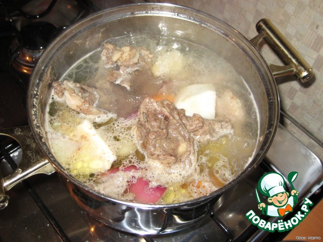 Через три часа вынуть из оставшегося бульона мясо, разобрать от костей. Бульон процедить.