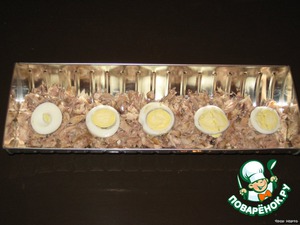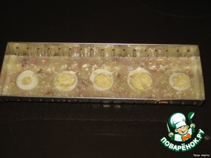 Яйцо нарезать кружочками. Выложить сверху на мясо.