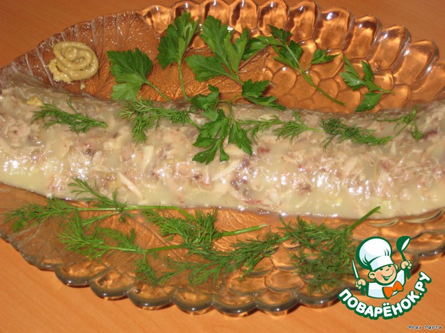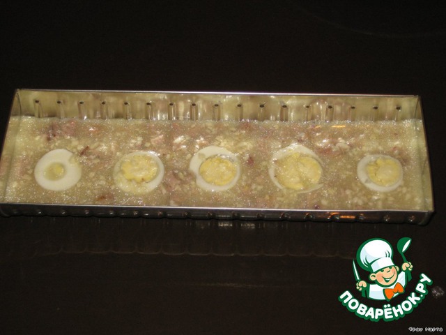 На следующий день опустить форму на несколько секунд в горячую воду и достать холодец на блюдо.