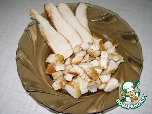 Из белого хлеба вырезать кубики, без корочки. Кубики и обрезки хлеба обжаривать со всех сторон на сухой сковородке, в конце жарки добавить сливочное масло, чтобы сухарики его впитали. Посыпать их сверху приправкой, любой, но с солью. Обрезки измельчить, я истолкла в ступке. Крошка должна быть крупной.