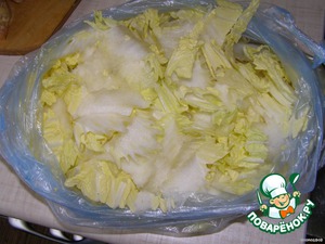 Пекинку нарезать крупно, утолщенные части листа разрезать вдоль, чтобы было тоненько.