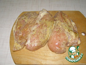 Замариновать куриное филев смеси майонеза, соевого соуса, приправы для курицы на пару часов. А вообще, мариновать можно в чем угодно, кому как нравится, только без кислоты.
