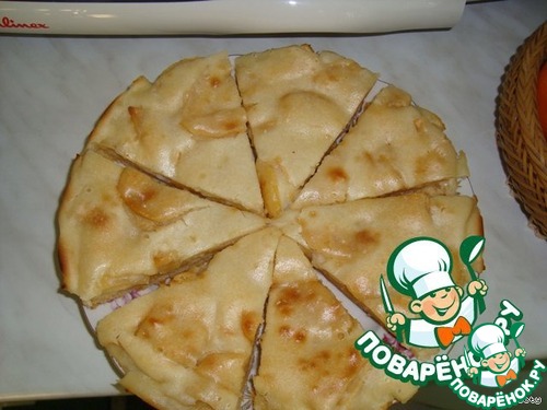 Наверх на тесто выкладываем яблоки нарезанные и заливаем заливкой. Ставим на 200 градусов в духовку на 45 минут.