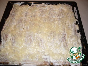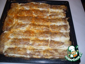 завернуть блинчики,уложить их на противень,полить сметаной и посыпать тертым сыром.Поставить в духовку минут на 30 мин.