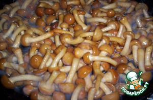 - опят разморозить на разогретой сковородке, образовавшуюся жидкость слить, грибы посолить+поперчить