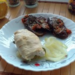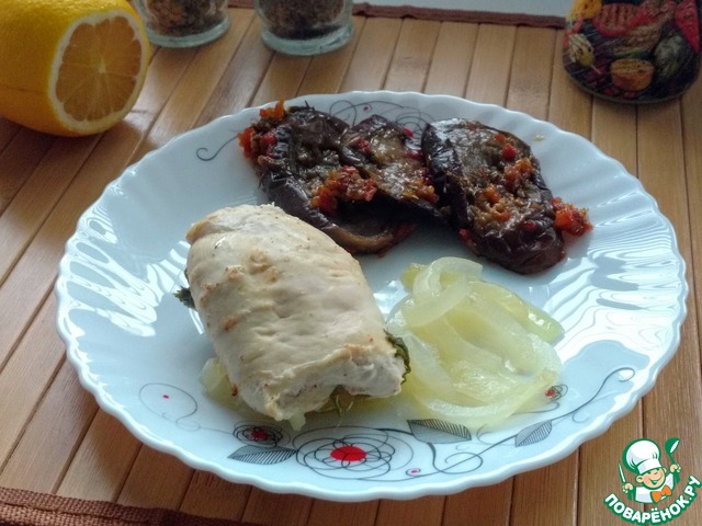 Такой рулетик помещаем на лук, зелень и лимончик -