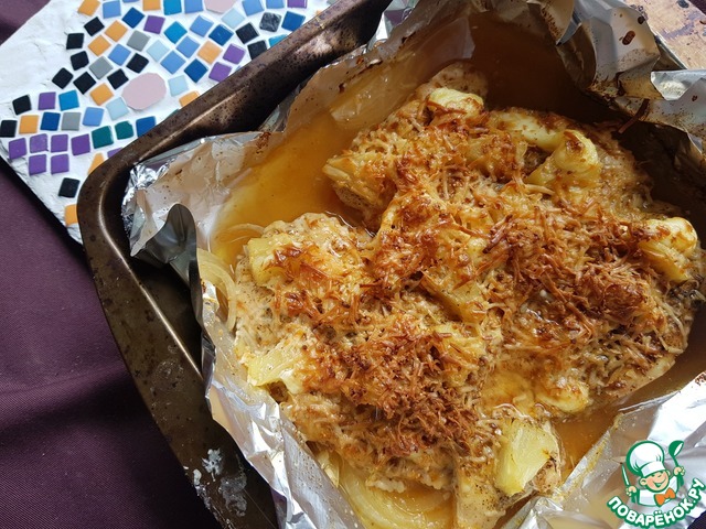 Потом в большую жаропрочную посуду складывать все слоями: лук, мясо, ананасы, майонез, сыр и ставим в духовку (200*C) на 1 час.