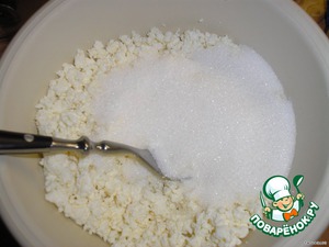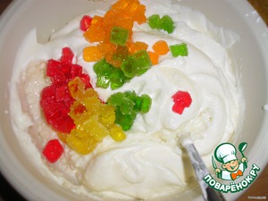 В творожную массу добавляем взбитые сливки с сахаром и нарезанные дольки мармелада