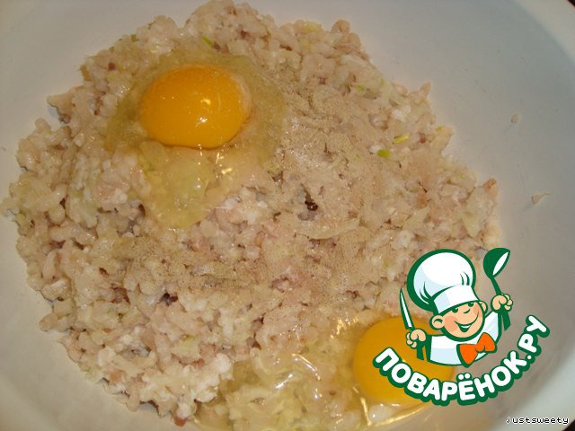 К готовому фаршу добавляем соль, перец, яйца, сахар.
