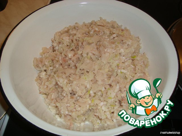 Перекручиваем филе, лук и свиное сало на мясорубке, чтобы получился фарш.