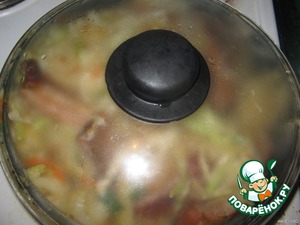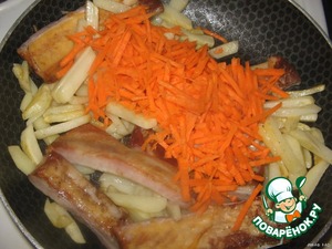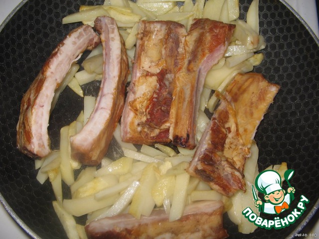 Добавить рёбрышки, у меня они были довольно жирные, потому я постаралась вытопить из них лишний жирок. Добавлять их в самом начале нужно ещё и для того, чтобы они щедро "отдали" свой копчёный аромат овощам.
