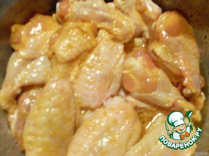 Крылышки разрезаем по суставам, солим, перчим, посыпаем куркумой, вымешиваем