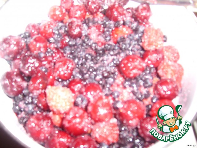 Ягоды посыпаем сахаром по вкусу (у меня покупная вишня и по горсточке своей черники и клубники, заброшенных летом в морозилку).