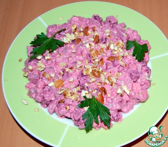 На первый взгляд простой и очень будничный салат. Тем более компоненты... свекла с чесночком, сыром и майонезом... классика... Но немного мяса и яичек, и салат приобретает совершенно иной вкус. А орешки придают будничному блюду праздничный вид...