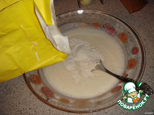 Всё смешать и добавить муку 2 стак. Тесто должно быть по консистенции как на оладьи.