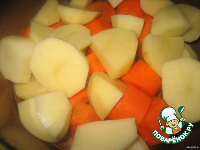 отдельно в другую посуду укладываем почищенные и порезанные на не очень крупные части картофель и морковь-пускай ждут своей очереди...