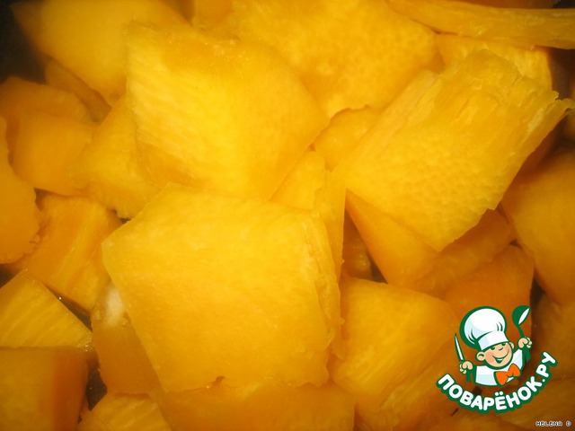 чистим и режем на кусочки нашу тыкву-красавицу,укладываем ей в посуду и ставим в печь минут на 10