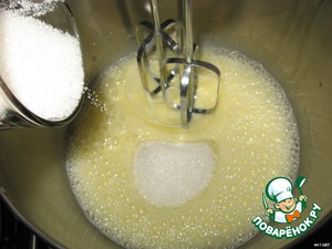 Затем постепенно всыпаем сахар и взбиваем до белой пышной массы.