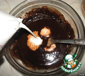 Смешиваем в миске растопленное сливочное масло, сахар и какао. -