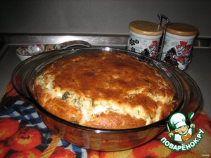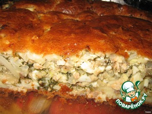 В смазанную маслом форму (форма должна быть с высокими бортиками, так как пирог хорошо поднимается) выкладываем две трети теста, сверху начинку.