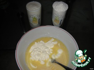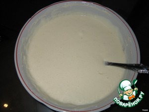 Замешиваем тесто. Для этого соединяем 3 яйца, майонез, кефир и муку. Солить не нужно, так как в майонезе и так достаточно соли.