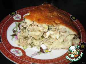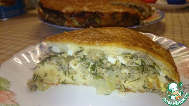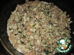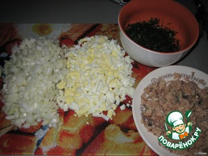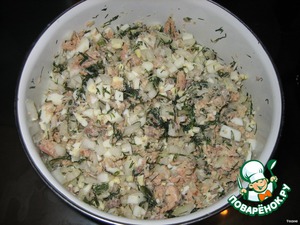Подготовим все для начинки. Мелко нарезаем отварные яйца, лук, укроп. Консервы, предварительно слив жидкость, разомнем вилкой. Добавим по вкусу соли.