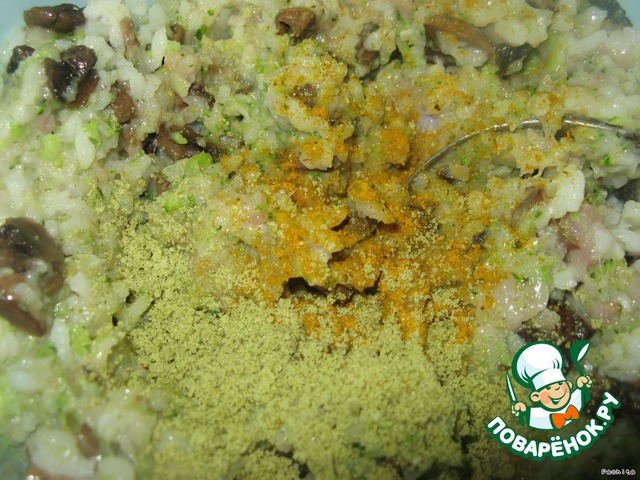Добавить вместе с вареным рисом в фарш. Посолить, поперчить, хорошо перемешать.