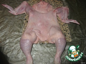 С подготовленной курицы аккуратно снять шкуру, начиная со спинки. Крылья и ножки отрубить по суставу.