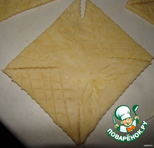 Тесто раскатайте... разрежьте на квадраты примерно 8x8 см...