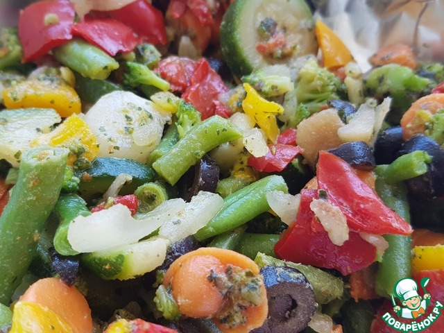 При готовке овощи следует неплотно накрыть пленкой, оставив по краю 3 -4 см незакрытыми. В середине процесса готовки помешайте, переверните и перераспределите овощи. Еще раз перемешайте по окончании процесса приготовления в печи Panasonic. Оставьте накрытыми для устойки на 2 -3 минуты.