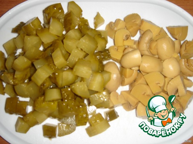 Грибы (у меня шампиньоны) и огурцы порезать кубиками.