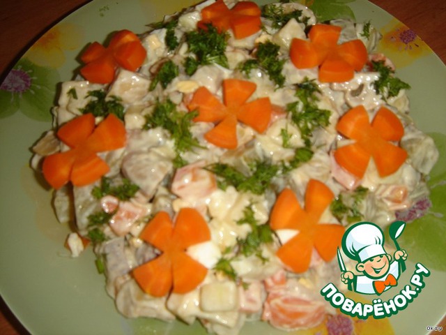 Выложить в салатник, украсить и присыпать рубленной зеленью.