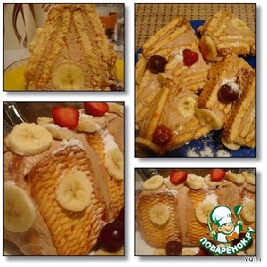 Края пленки поднять и соединить. Печенье должно лечь треугольником (в виде крыши дома). Для прочности я ещё обмотала края пищевой пленкой.