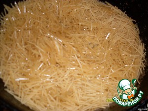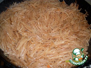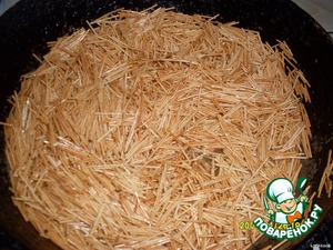 Сырые макароны положить на сковородку с растительным маслом и обжарить на сильном огне, постоянно помешивая