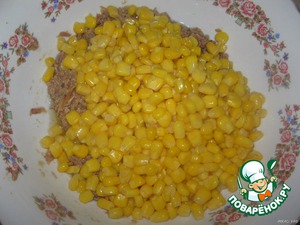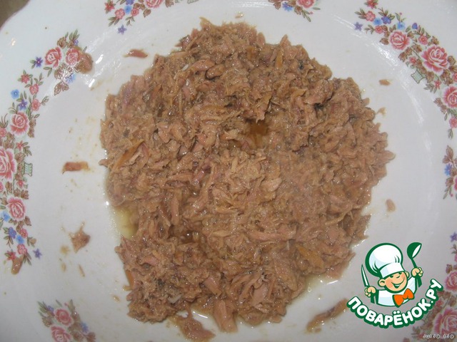 Тунец - выкладываем из банки и сливаем половину жидкости (если её, как у меня, было много. У меня, вообще, тунец в масле оказался (вот так мужа за продуктами посылать!), но лучше натурального).