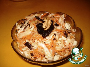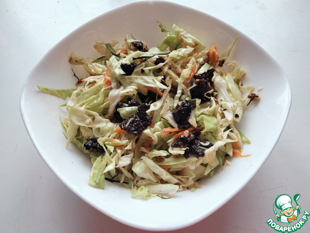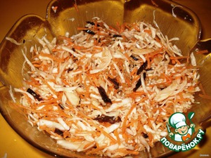 Капусту нашинковать, немного перетереть с солью, добавить тертую морковь и нарезанный распаренный чернослив.