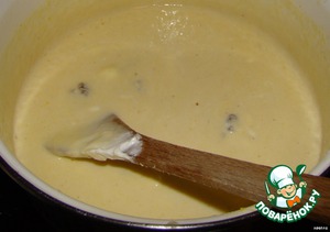 Желатин залейте водой.. и оставьте набухать. В загустевший горячий крем добавляем изюм... творог... и желатин
