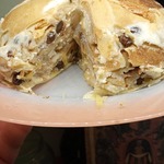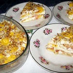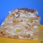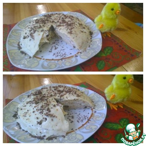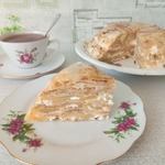 [+5]Блины готовила по своему рецепту, изюма не оказалось дома, молока в крем добавляла больше, хотелось посочнее тортик. Да, ещё чайную ложку ванильного сахара всыпала.