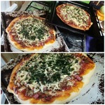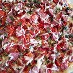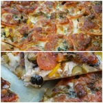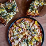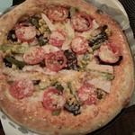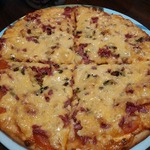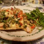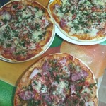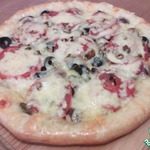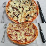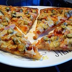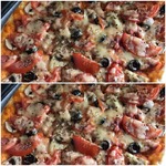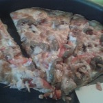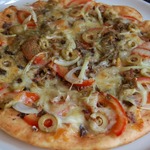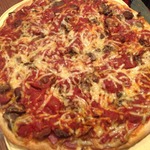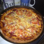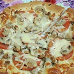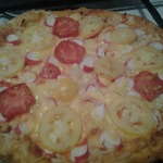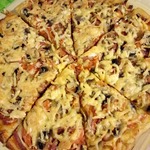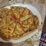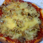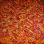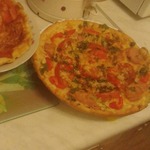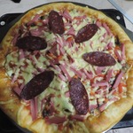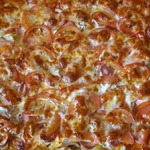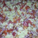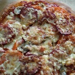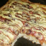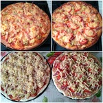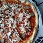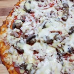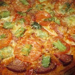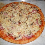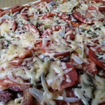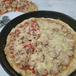 Для начинки на 1 пиццу - 3-4 больших шампиньона (быстро обжарила), 1/2 перца болгарского, 1/2 синей луковицы, вареная колбаса кружок толщиной 5 см, 150г сыра, на основу - 2 ст ложки томатного соуса густого смешать с 2 ст.ложками майонеза.