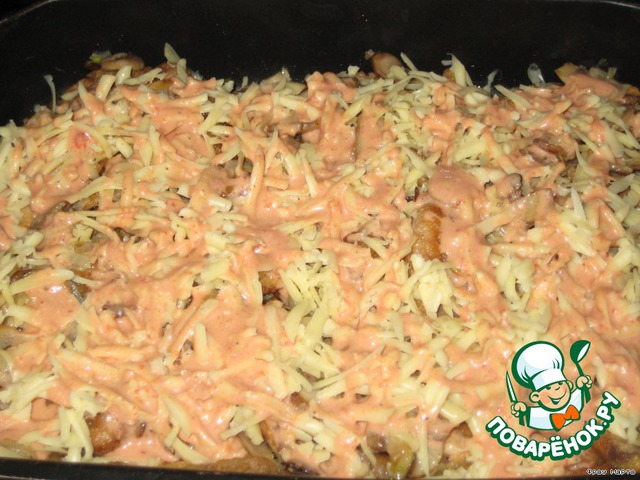 В форму выкладываем обжаренную свининку, сверху грибы с луком, затем сыр и заливаем соусом.