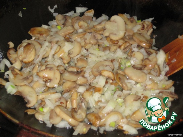 Грибы нарезать произвольно (кому как нравится) и обжарить на растительном масле с добавлением лука в течение 15 минут. -