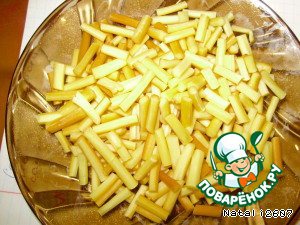 Копченый сыр в косичках расплести и нарезать небольшими отрезками.