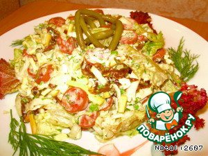 Этот салатик я увидела в одной из телевизионных программ. Он меня заинтриговал, решила приготовить. Результат был налицо, когда я увидела пустой салатник после ужина. Вкусненький салатик с копчеными ингредиентами. Уж очень он полюбился моему мужу.