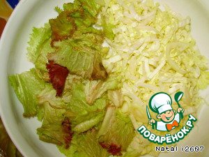 Салат порвать руками, а пекинскую капусту нарезать полосками.